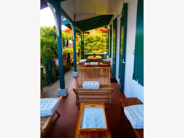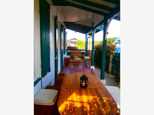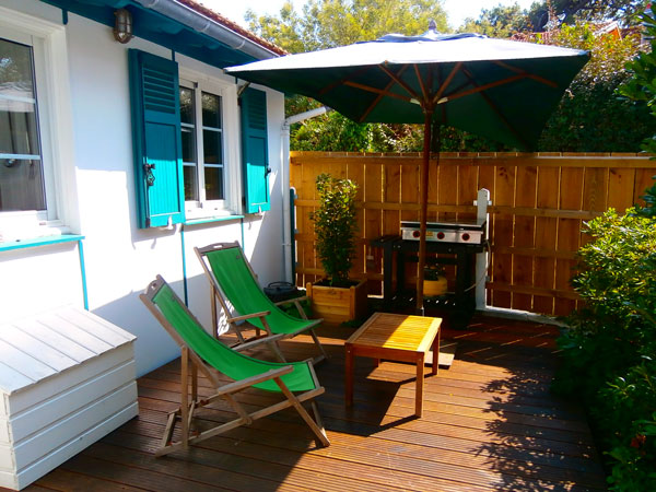 Elle offre deux terrasses : à l'Est, avec un coin repas côté Bassin et à l'Ouest, côté jardin avec chaises longues, parasol et barbecue.